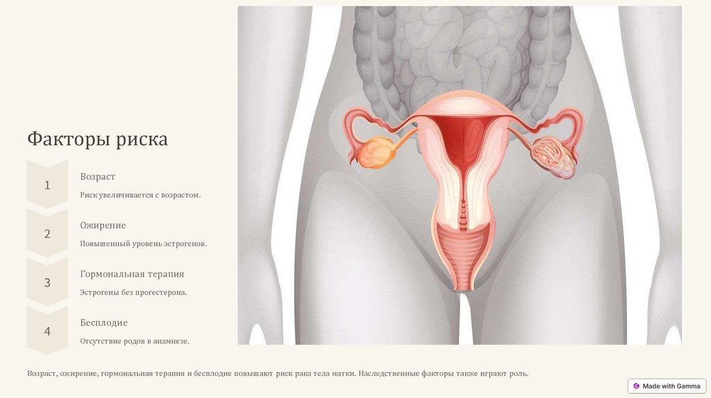 Возраст, ожирение, гормональная терапия и бесплодие повышают риск рака тела матки. Наследственные факторы также играют роль.