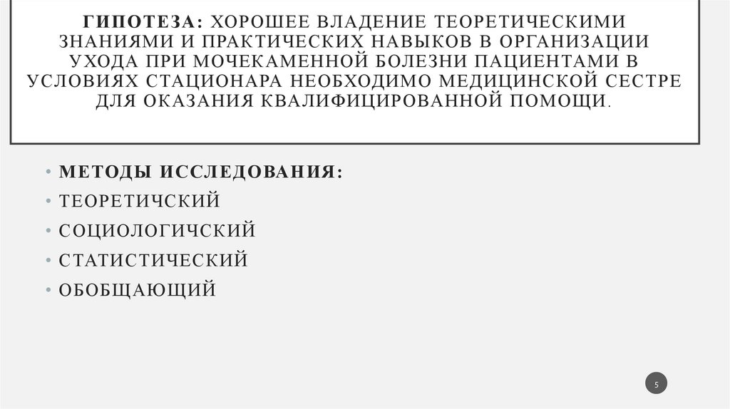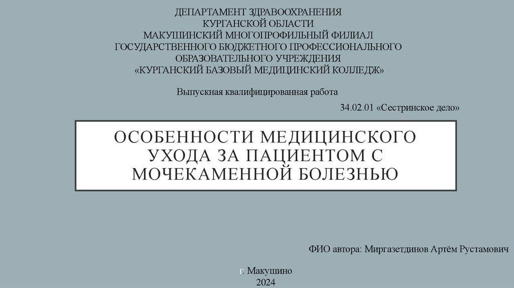 Цель исследования: роль медицинской сестры в лечебнодиагностическом процессе при мочекаменной болезни.Предмет исследования: особенности медицинского ухода за