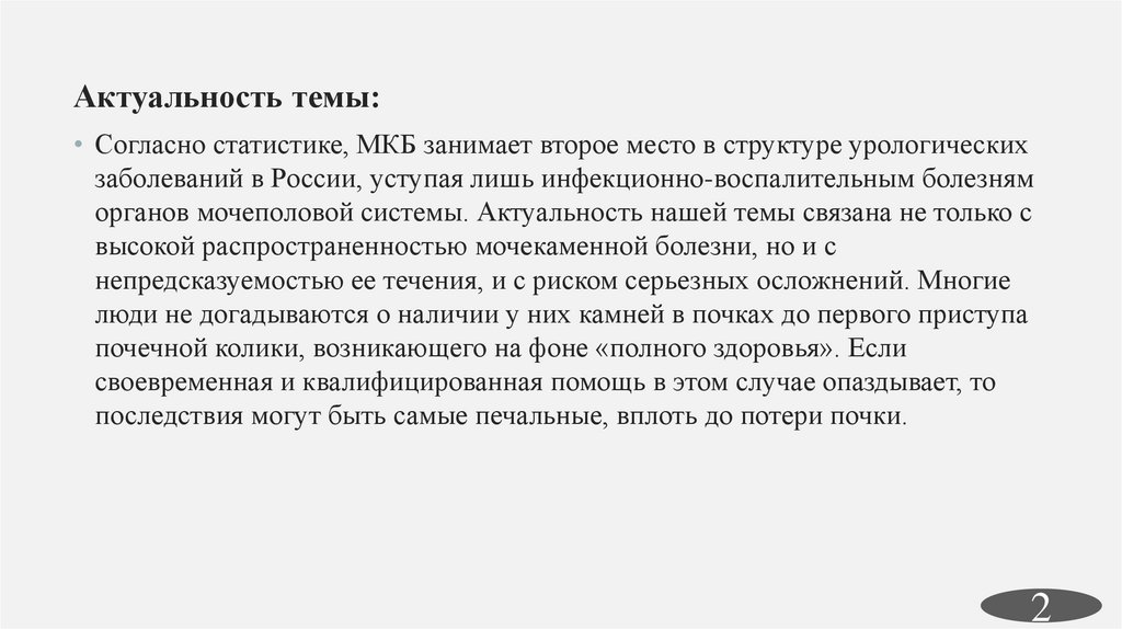 Актуальность темы:• Согласно статистике, МКБ занимает второе место в структуре урологических
