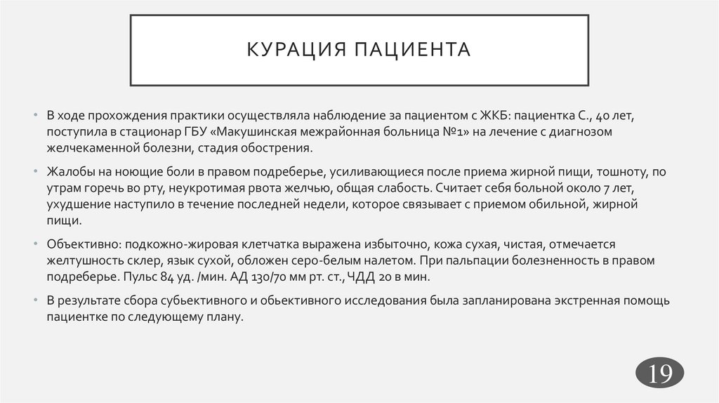 КУРАЦИЯ ПАЦИЕНТА• В ходе прохождения практики осуществляла наблюдение за пациентом с ЖКБ: пациентка С., 40 лет,