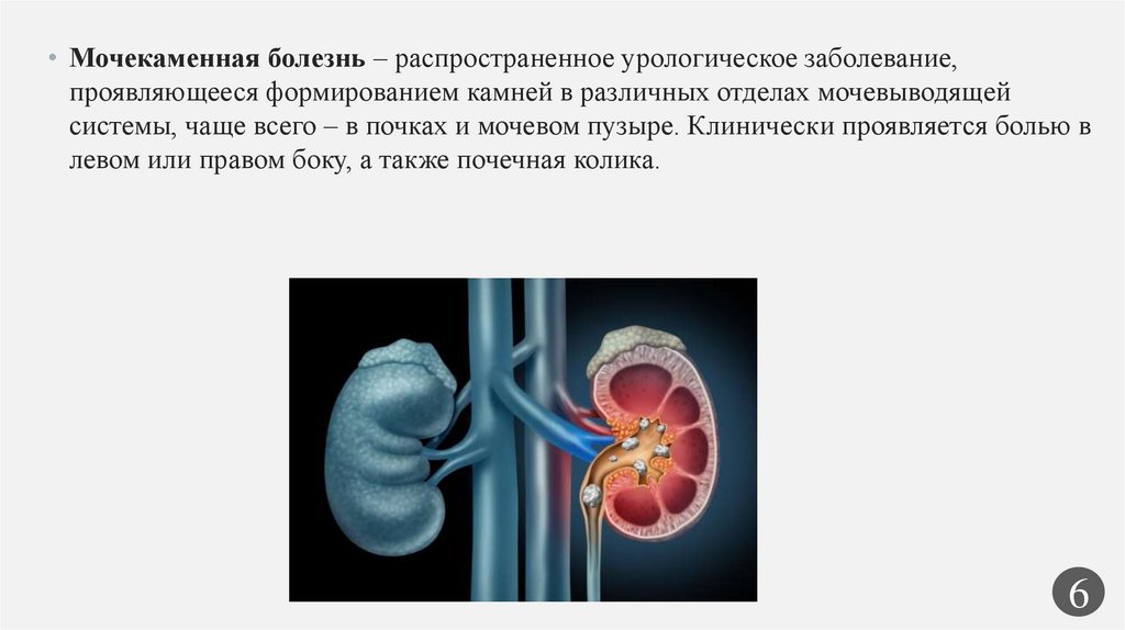 • Мочекаменная болезнь – распространенное урологическое заболевание,проявляющееся формированием камней в различных отделах мочевыводящей
