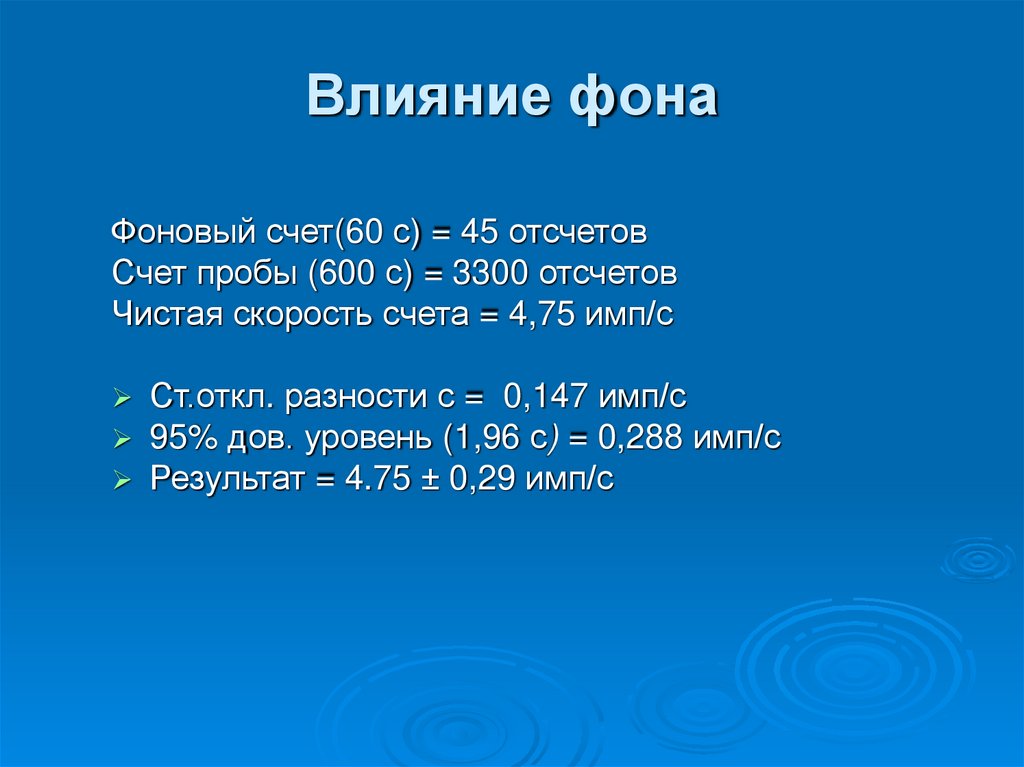 Фоновый счет(60 с) = 45 отсчетовСчет пробы (600 с) = 3300 отсчетов