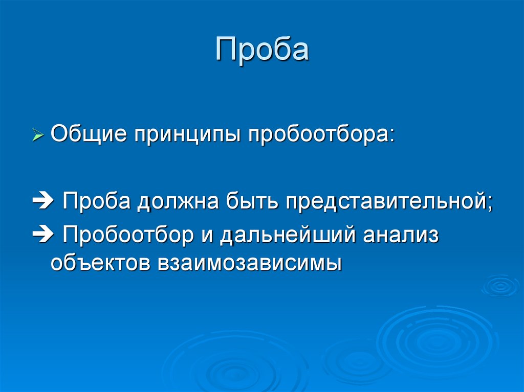 Общие принципы пробоотбора:Проба должна быть представительной;