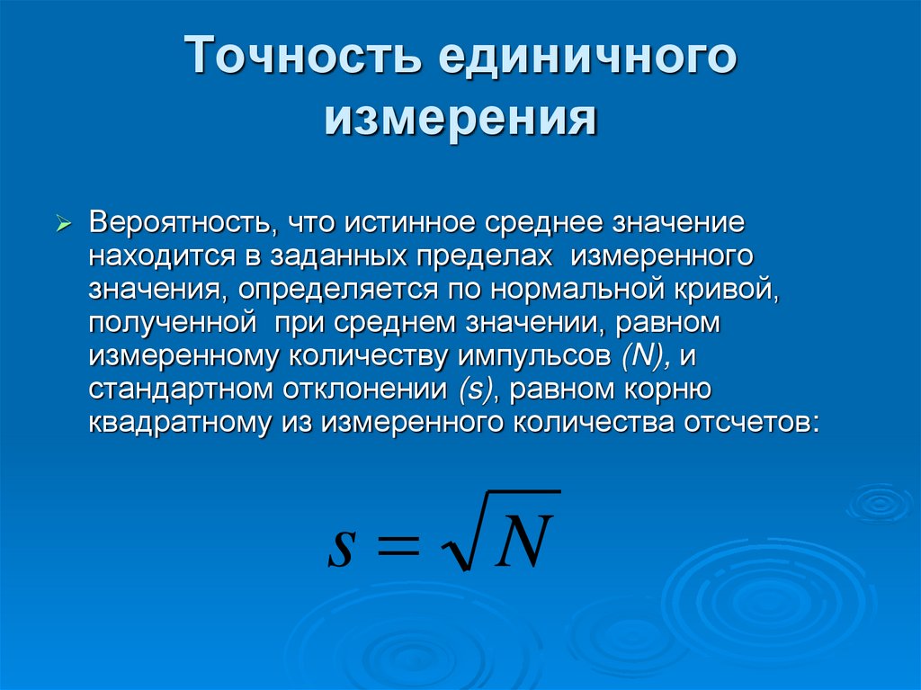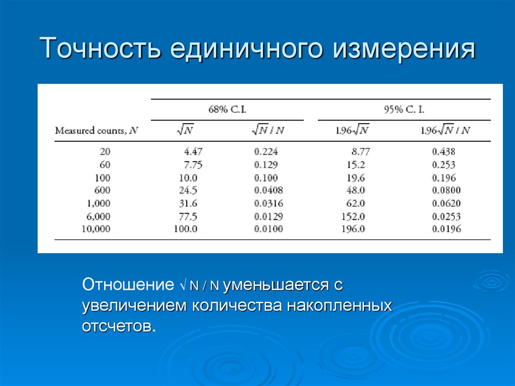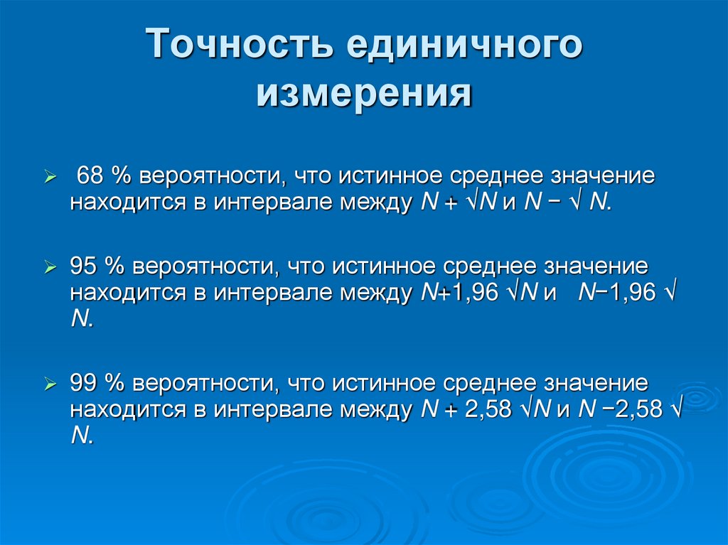68 % вероятности, что истинное среднее значениенаходится в интервале между N + √N и N − √ N.