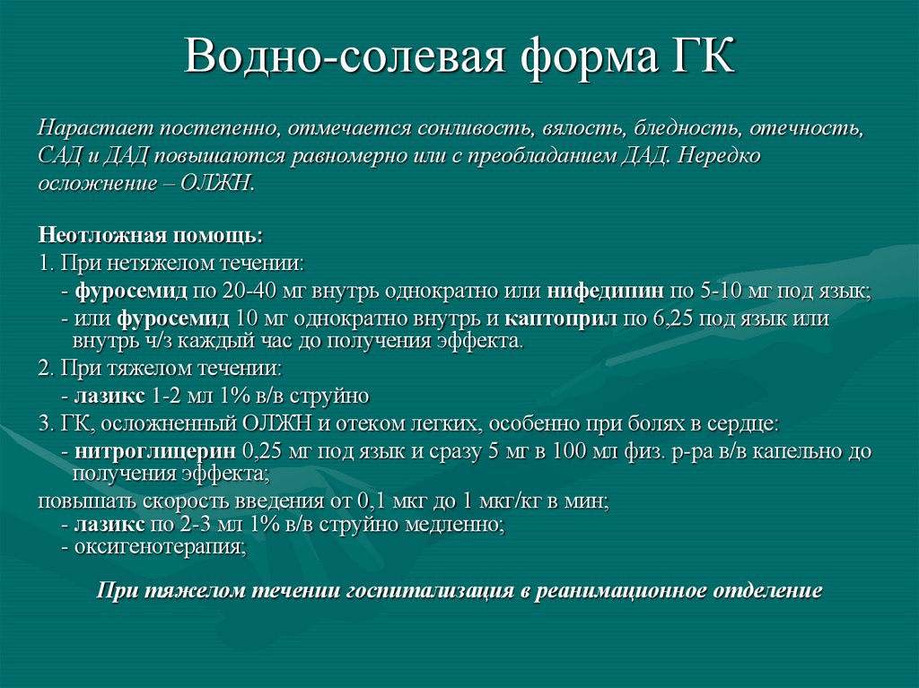 - фуросемид по 20-40 мг внутрь однократно или нифедипин по 5-10 мг под язык;
