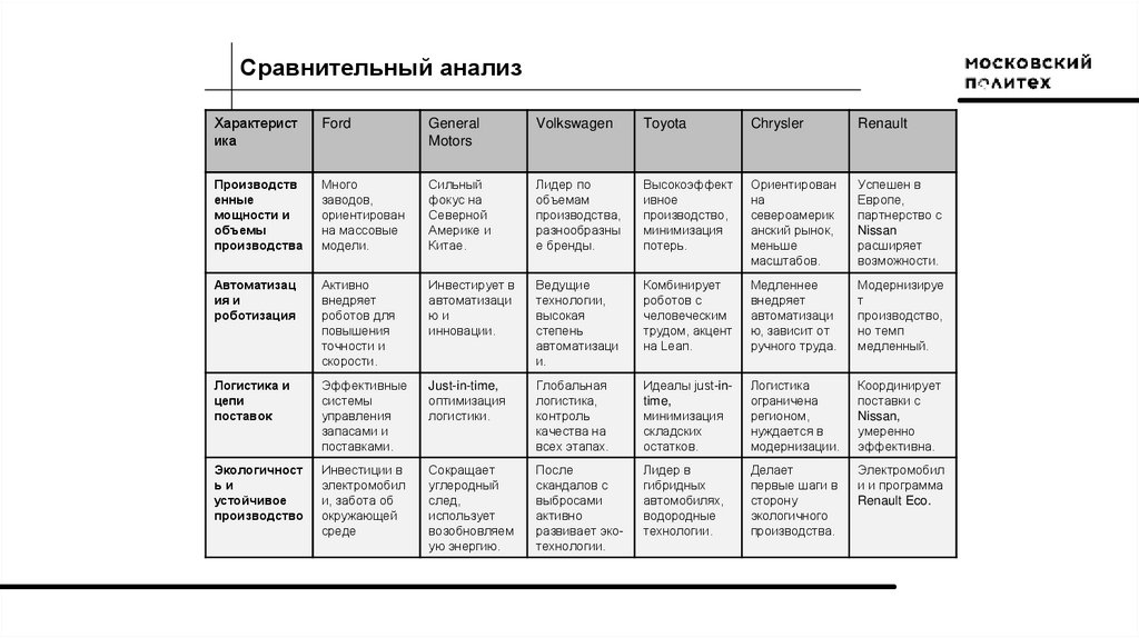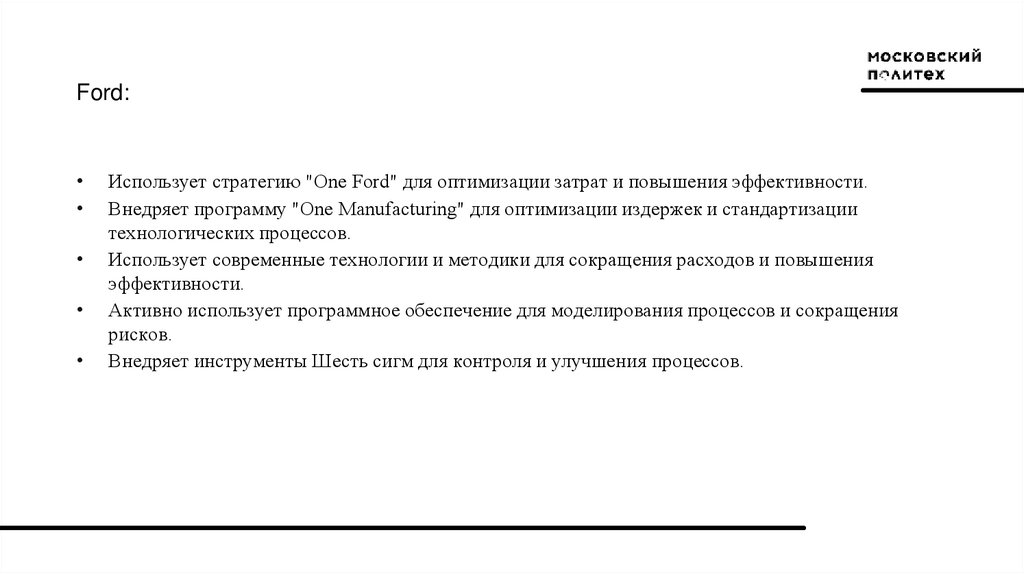 Ford:Использует стратегию "One Ford" для оптимизации затрат и повышения эффективности.