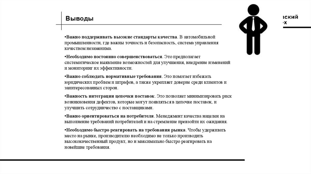 Выводы•Важно поддерживать высокие стандарты качества. В автомобильной