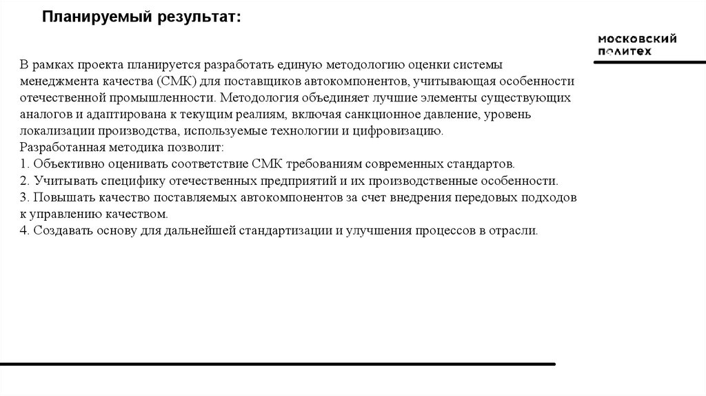 Планируемый результат:В рамках проекта планируется разработать единую методологию оценки системы