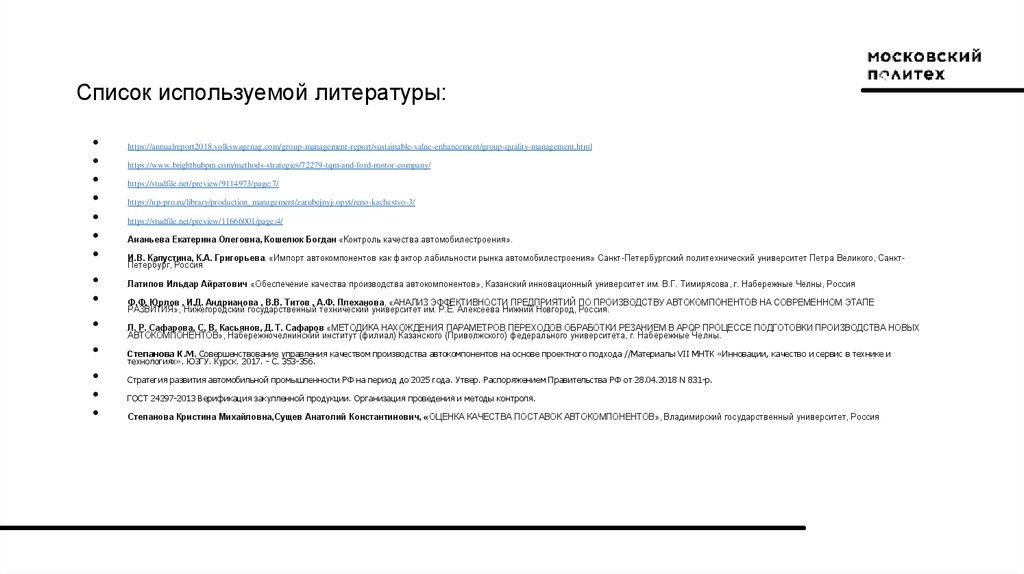 Список используемой литературы:https://annualreport2018.volkswagenag.com/group-management-report/sustainable-value-enhancement/group-quality-management.html