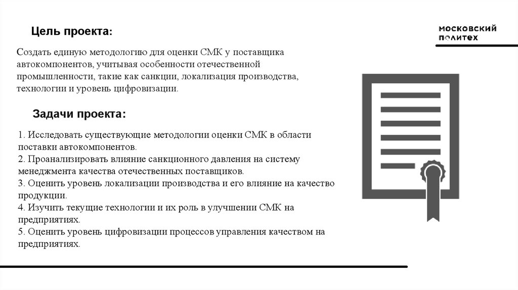 Цель проекта:Cоздать единую методологию для оценки СМК у поставщика