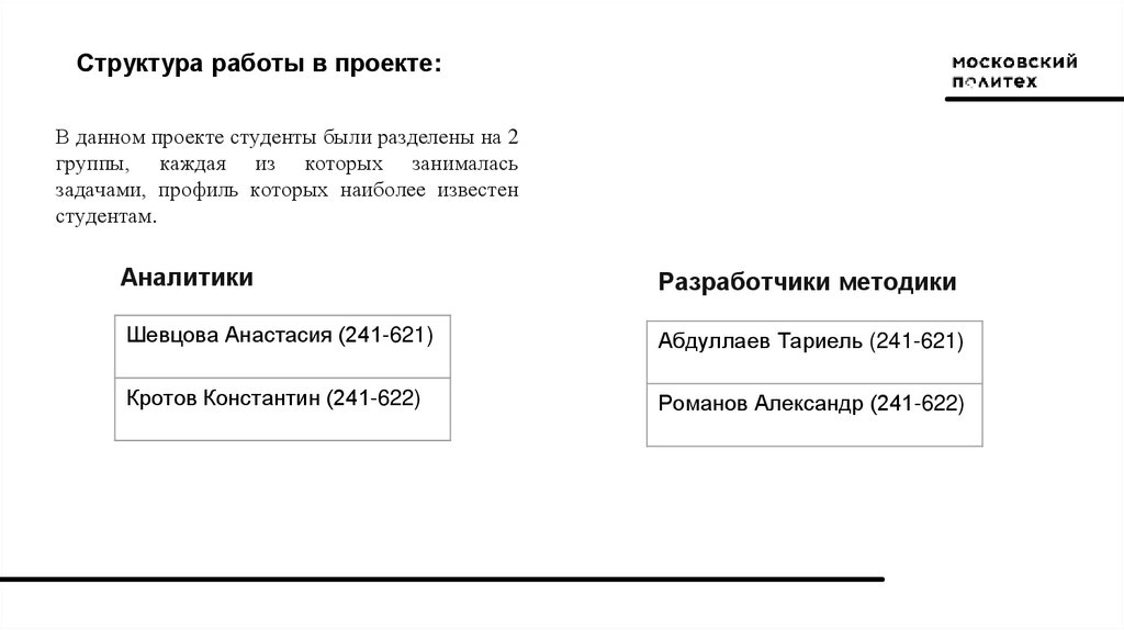 Структура работы в проекте:В данном проекте студенты были разделены на 2