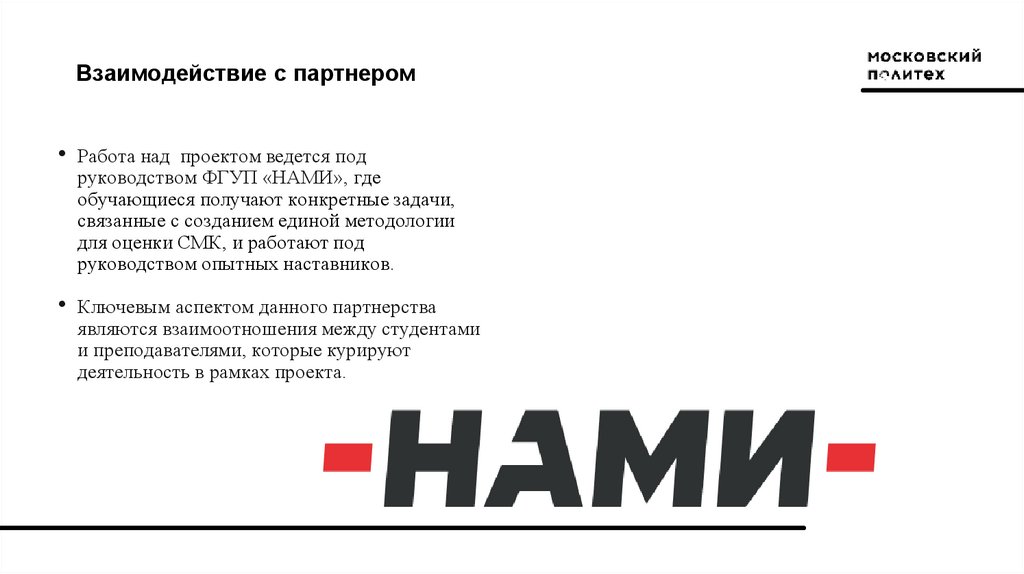 Взаимодействие с партнером• Работа над проектом ведется под