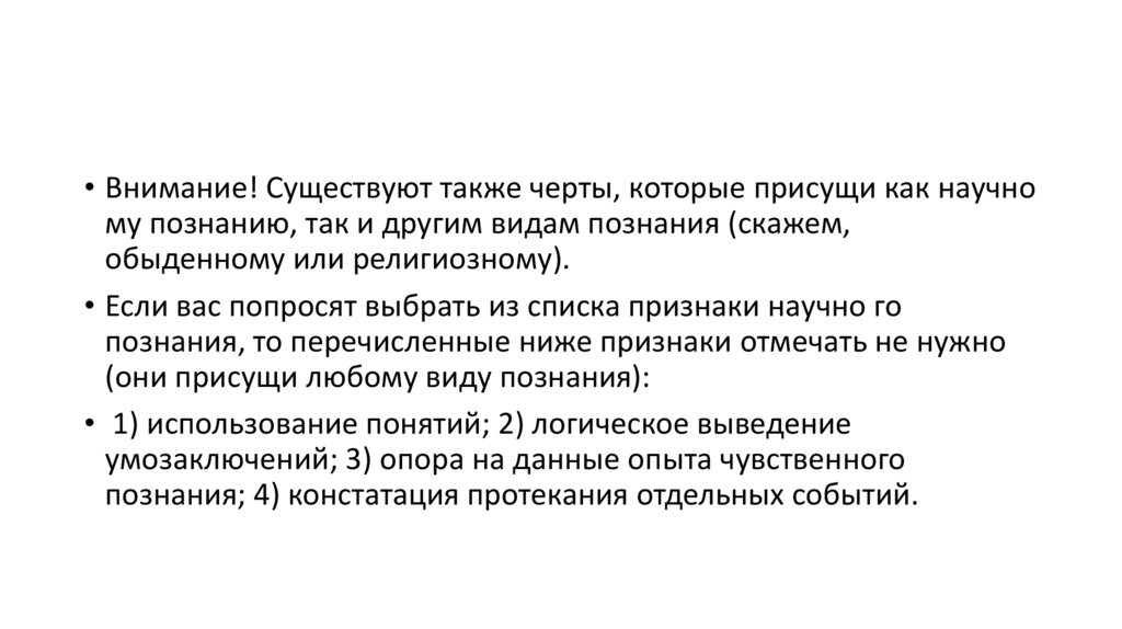 • Внимание! Существуют также черты, которые присущи как научному познанию, так и другим видам познания (скажем,