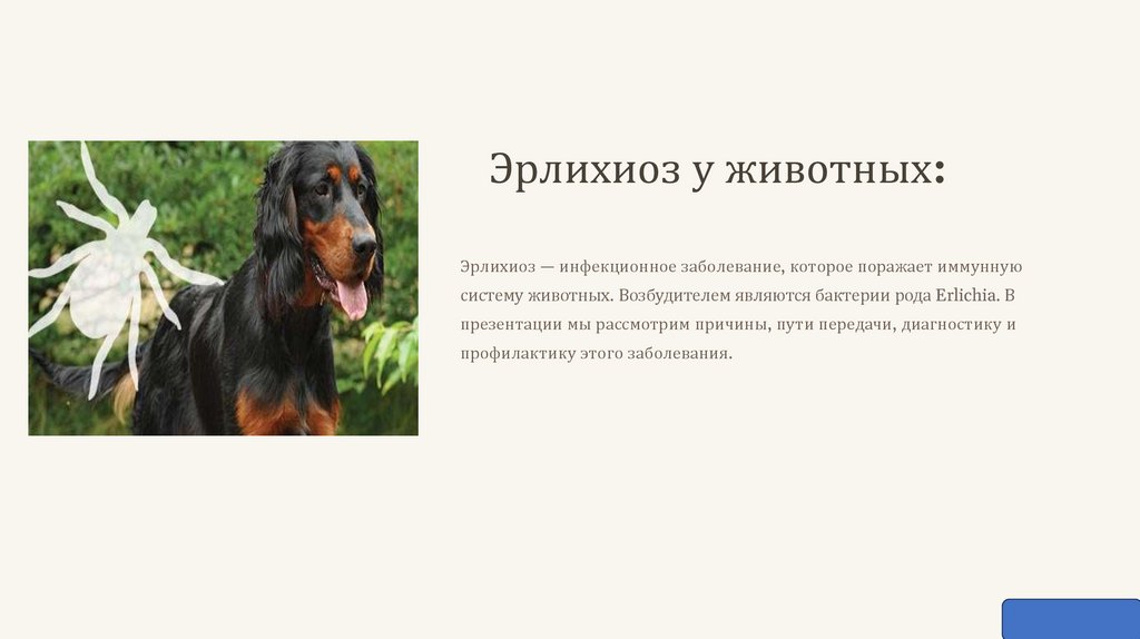 Эрлихиоз у животных:Эрлихиоз — инфекционное заболевание, которое поражает иммунную