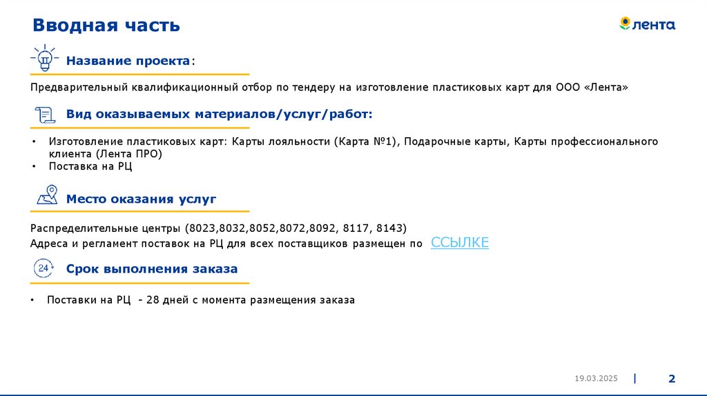 Доставка на РЦ и требования к упаковке1. Заказы на изготовление партии пластиковых карт поступают из Центрального офиса ООО Лента. Заказы