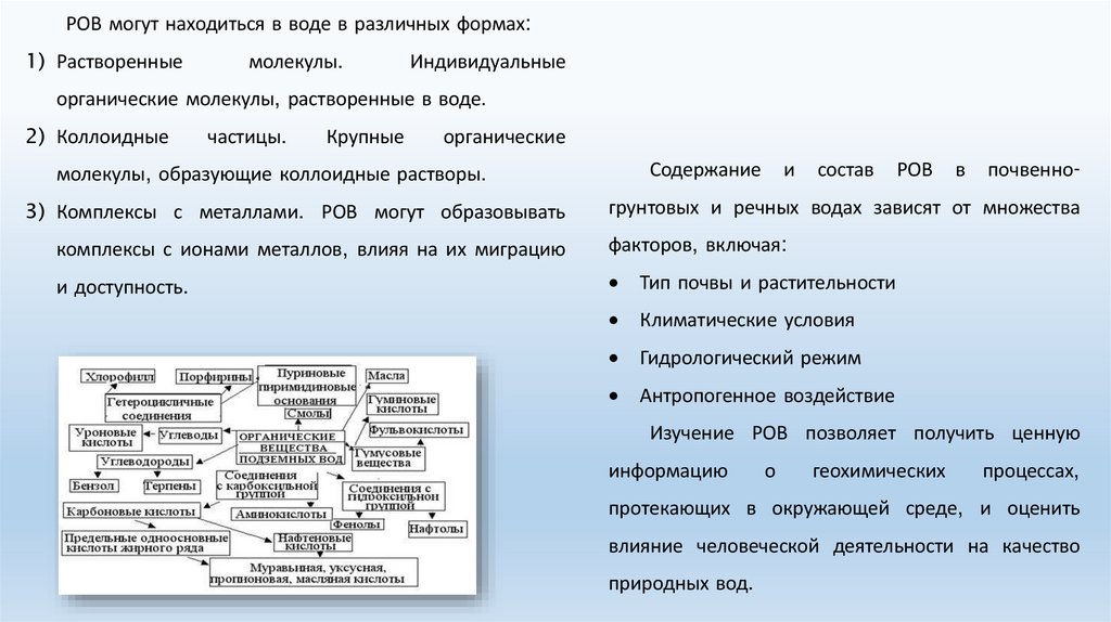 РОВ могут находиться в воде в различных формах:1) Растворенные