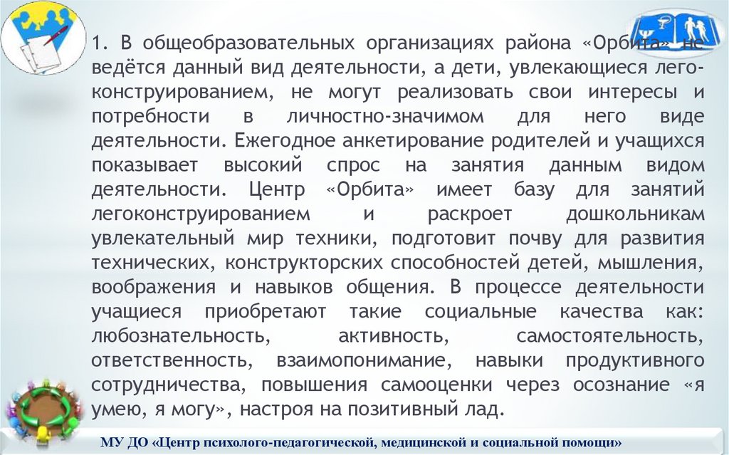 деятельности. Центр «Орбита» имеет базу для занятий