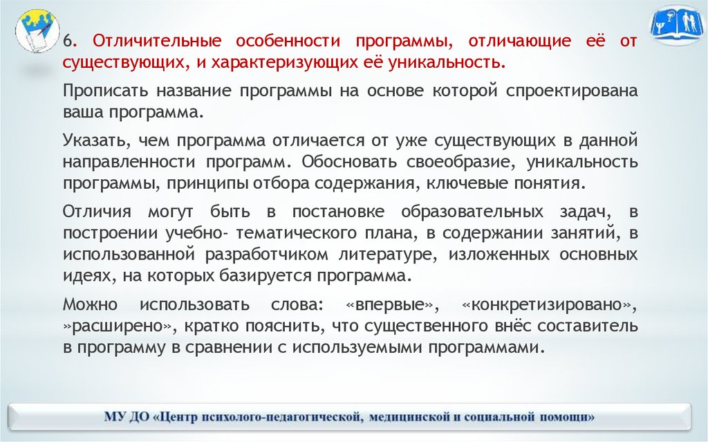 6. Отличительные особенности программы, отличающие её отсуществующих, и характеризующих её уникальность.