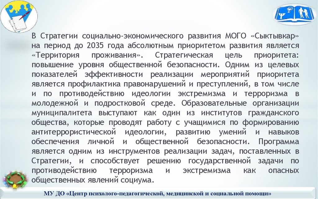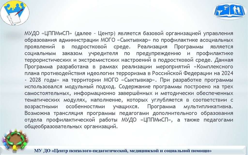 МУДО «ЦППМиСП» (далее – Центр) является базовой организацией управленияобразования администрации МОГО «Сыктывкар» по профилактике асоциальных