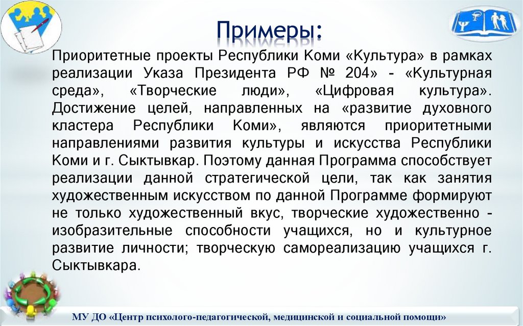 Примеры:Приоритетные проекты Республики Коми «Культура» в рамках