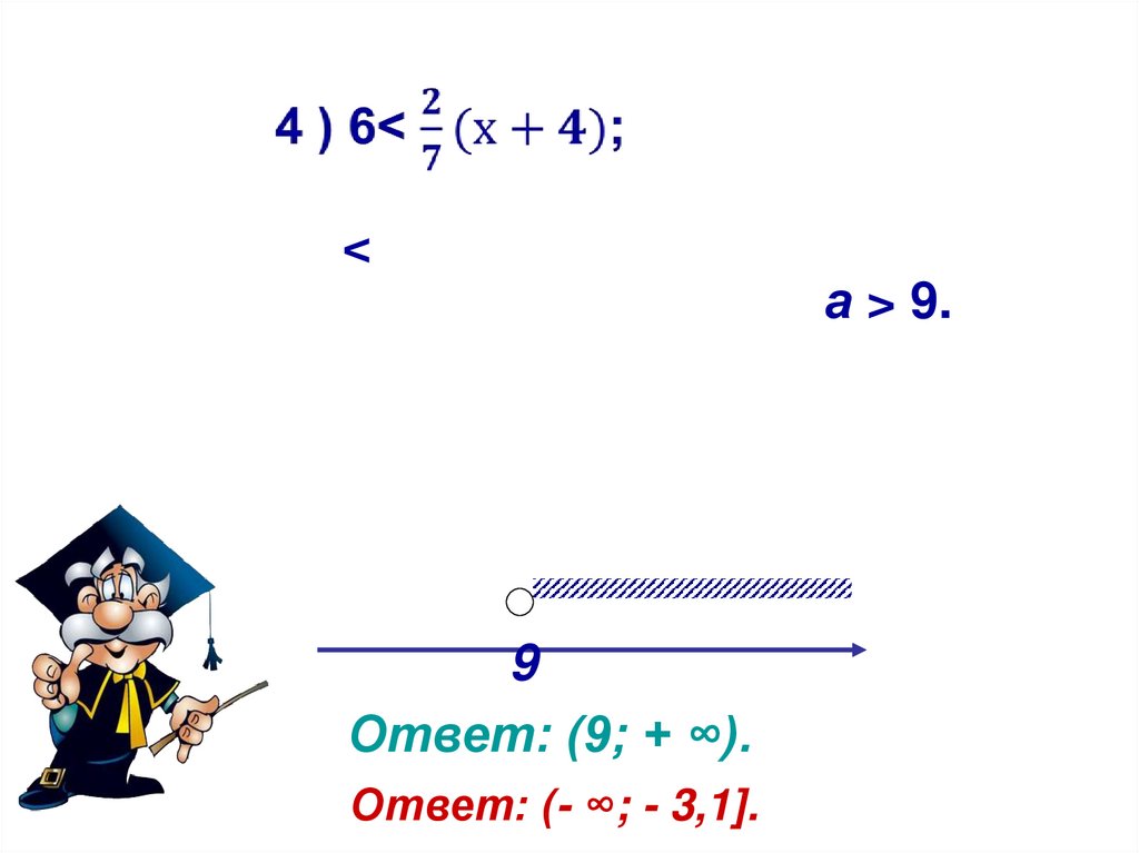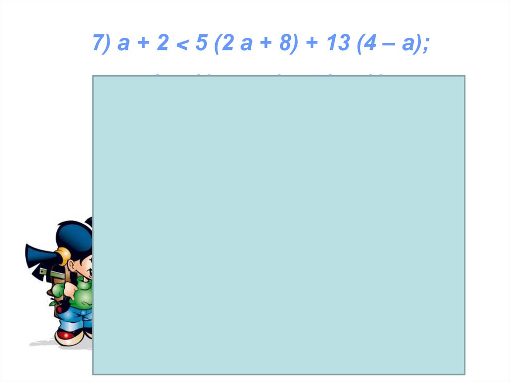 7) а + 2 < 5 (2 а + 8) + 13 (4 – а);а + 2 < 10 а + 40 + 52 – 13 а;