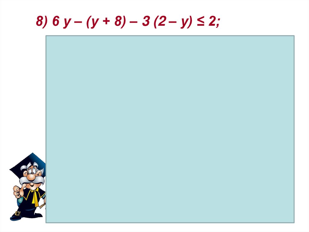 8) 6 у – (у + 8) – 3 (2 – у) ≤ 2;6 у – у – 8 – 6 + 3 у ≤ 2;