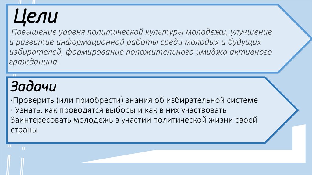ЦелиПовышение уровня политической культуры молодежи, улучшение