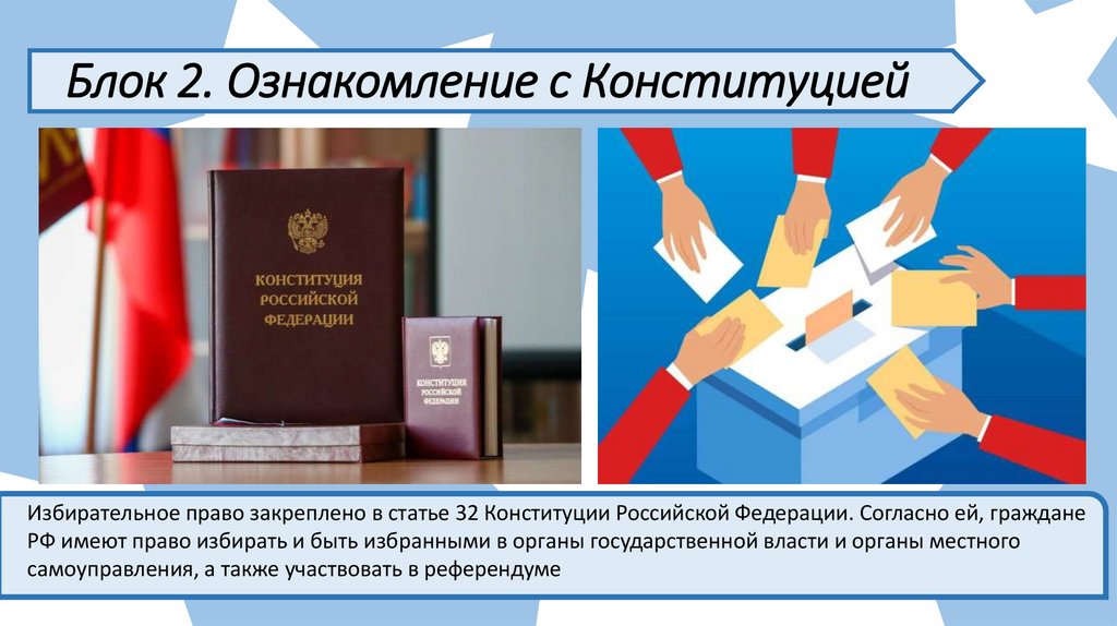 Блок 2. Ознакомление с КонституциейИзбирательное право закреплено в статье 32 Конституции Российской Федерации. Согласно ей, граждане