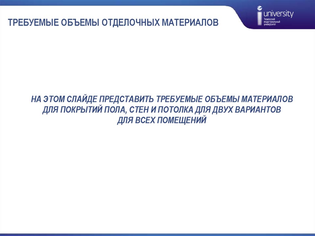ТРЕБУЕМЫЕ ОБЪЕМЫ ОТДЕЛОЧНЫХ МАТЕРИАЛОВНА ЭТОМ СЛАЙДЕ ПРЕДСТАВИТЬ ТРЕБУЕМЫЕ ОБЪЕМЫ МАТЕРИАЛОВ