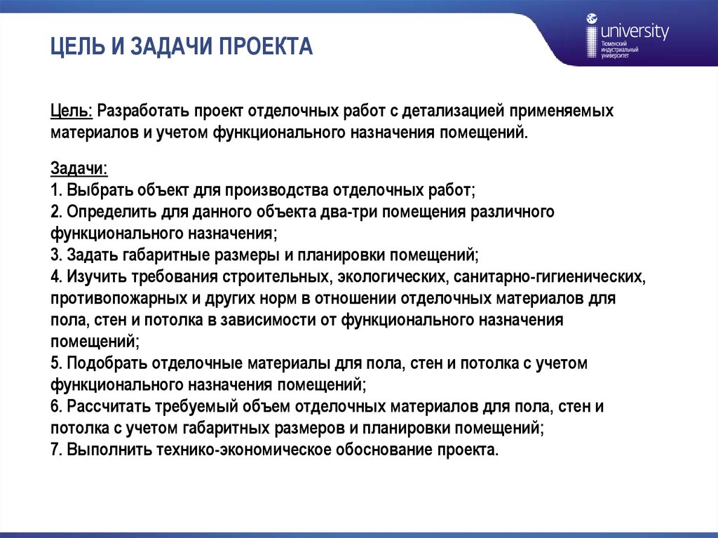 ЦЕЛЬ И ЗАДАЧИ ПРОЕКТАЦель: Разработать проект отделочных работ с детализацией применяемых