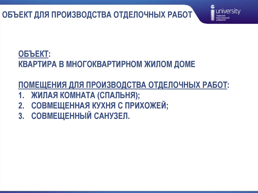 ОБЪЕКТ ДЛЯ ПРОИЗВОДСТВА ОТДЕЛОЧНЫХ РАБОТОБЪЕКТ: