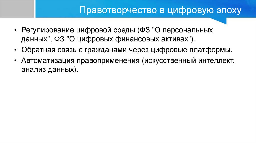 Правотворчество в цифровую эпоху• Регулирование цифровой среды (ФЗ "О персональных
