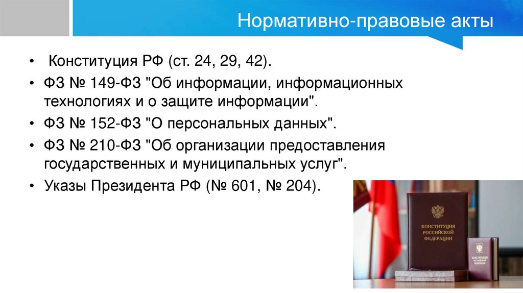 Нормативно-правовые акты• Конституция РФ (ст. 24, 29, 42).