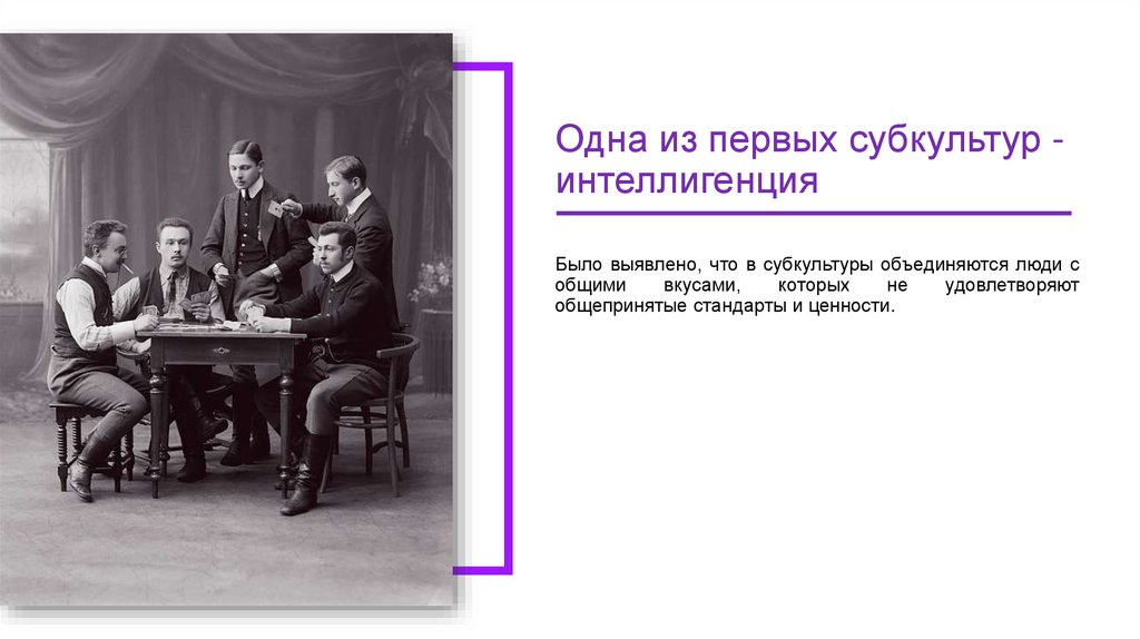 Одна из первых субкультур интеллигенцияБыло выявлено, что в субкультуры объединяются люди с