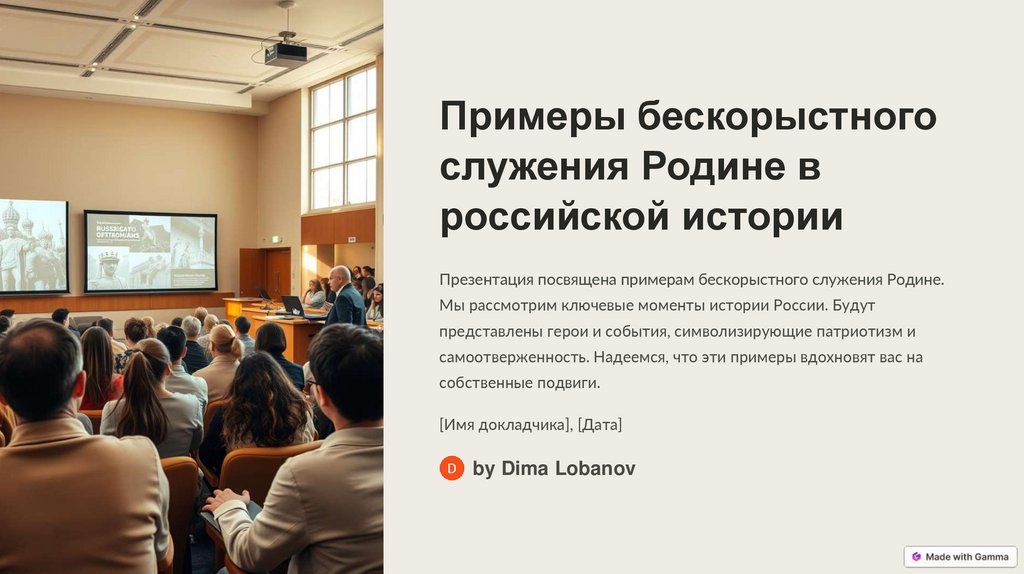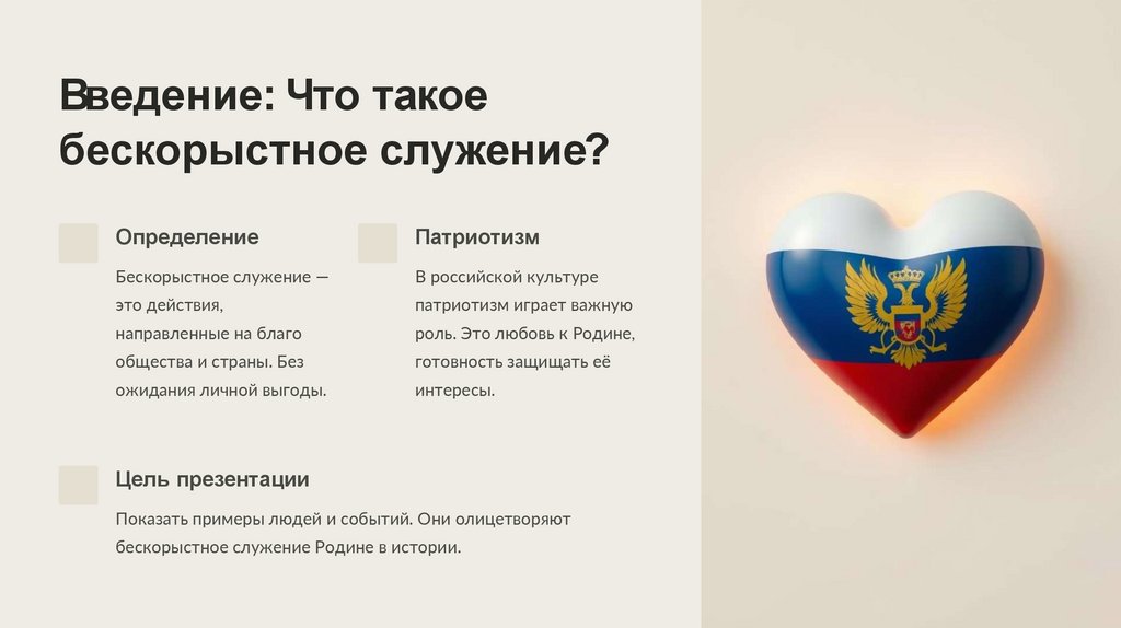 Презентация посвящена примерам бескорыстного служения Родине.
