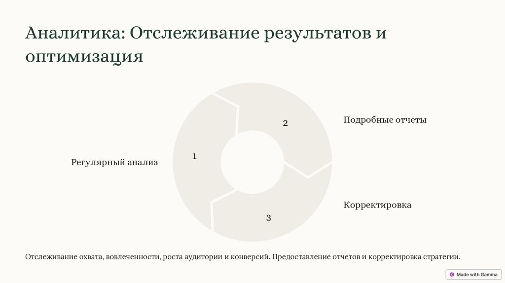 Отслеживание охвата, вовлеченности, роста аудитории и конверсий. Предоставление отчетов и корректировка стратегии.