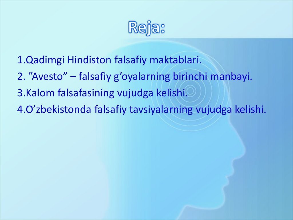 1.Qadimgi Hindiston falsafiy maktablari.2. ”Avesto” – falsafiy g’oyalarning birinchi manbayi.