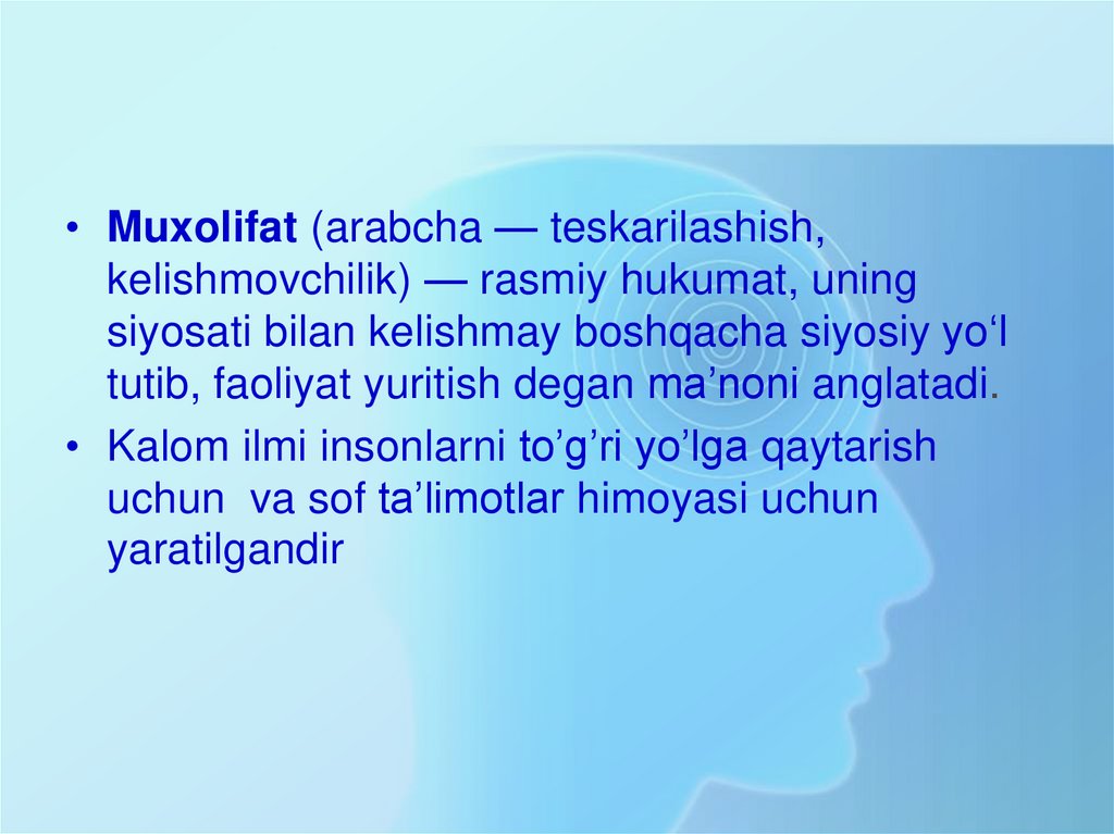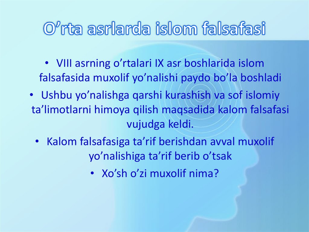 • VIII asrning o’rtalari IX asr boshlarida islomfalsafasida muxolif yo’nalishi paydo bo’la boshladi