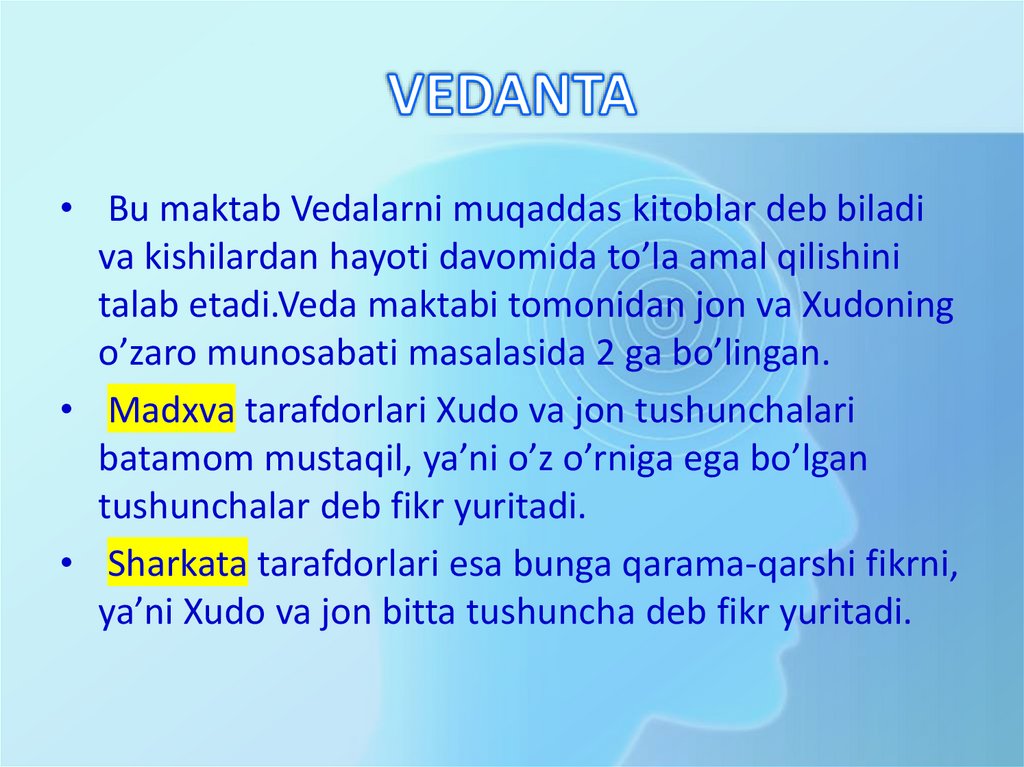 • Ushbu maktab vedalarni sharxlash va undagiaqidalarni falsafiy asoslashda muhim o’rin tutadi.