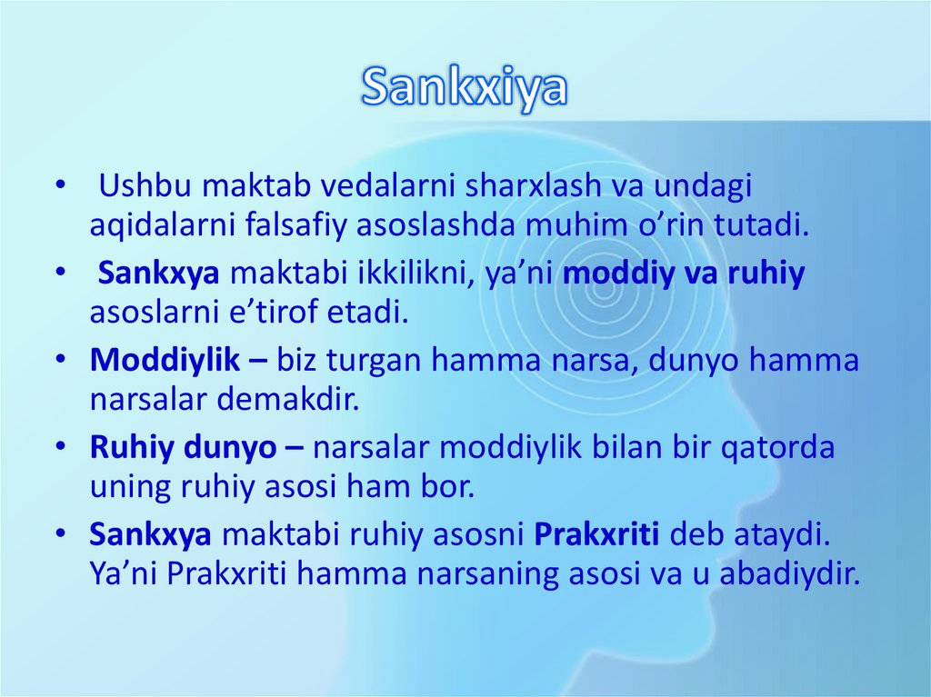 • Sankxya maktabi ikkilikni, ya’ni moddiy va ruhiy