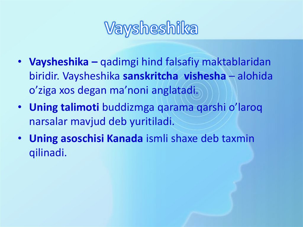 • Vaysheshika – qadimgi hind falsafiy maktablaridanbiridir. Vaysheshika sanskritcha vishesha – alohida