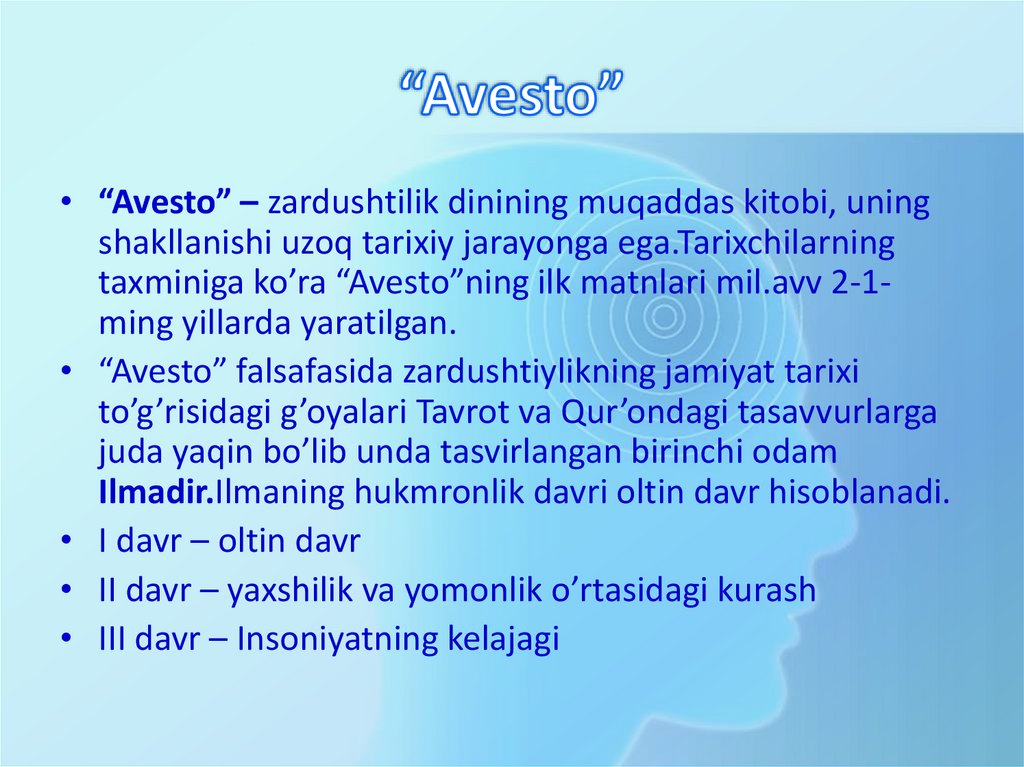 • “Avesto” – zardushtilik dinining muqaddas kitobi, uningshakllanishi uzoq tarixiy jarayonga ega.Tarixchilarning