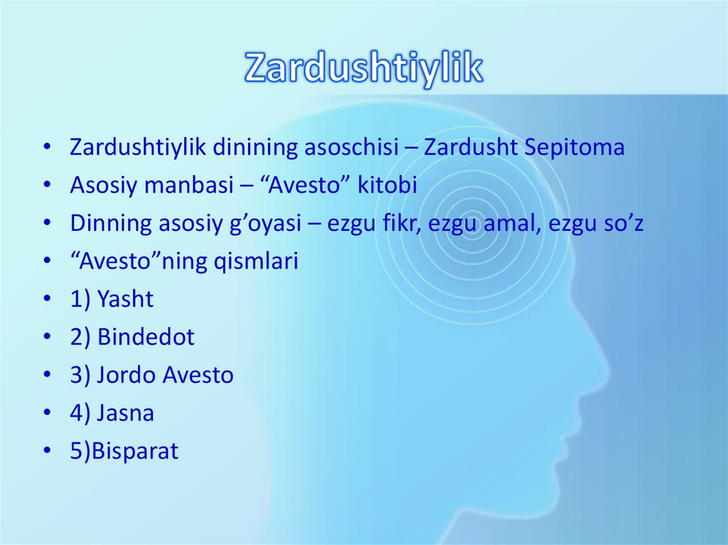 • Zardushtiylik dinining asoschisi – Zardusht Sepitoma• Asosiy manbasi – “Avesto” kitobi