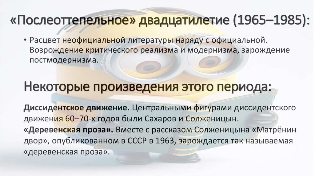 «Послеоттепельное» двадцатилетие (1965–1985):• Расцвет неофициальной литературы наряду с официальной.