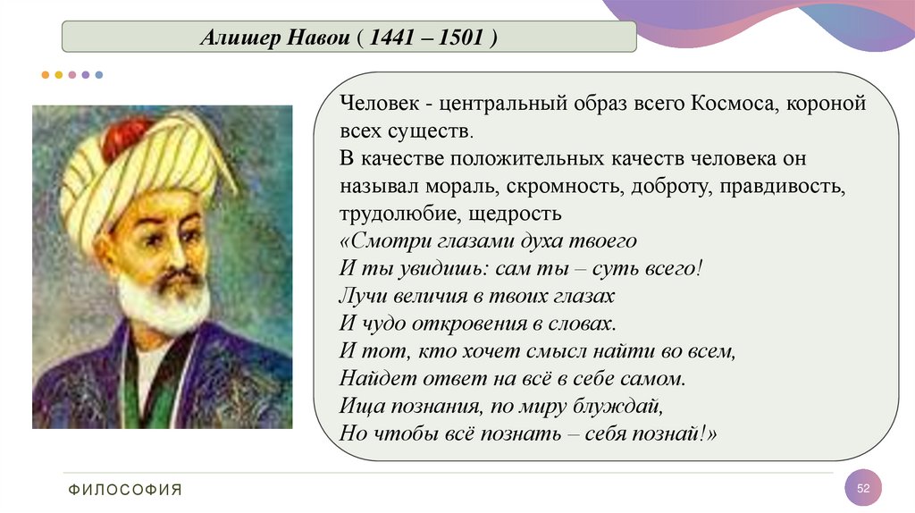 Алишер Навои ( 1441 – 1501 )Человек - центральный образ всего Космоса, короной