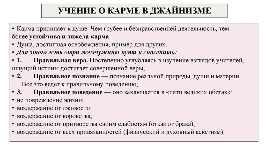 УЧЕНИЕ О КАРМЕ В ДЖАЙНИЗМЕ• Карма прилипает к душе. Чем грубее и безнравственней деятельность, тем