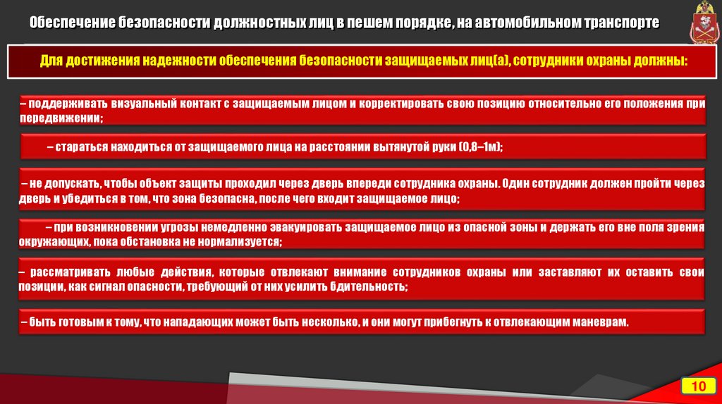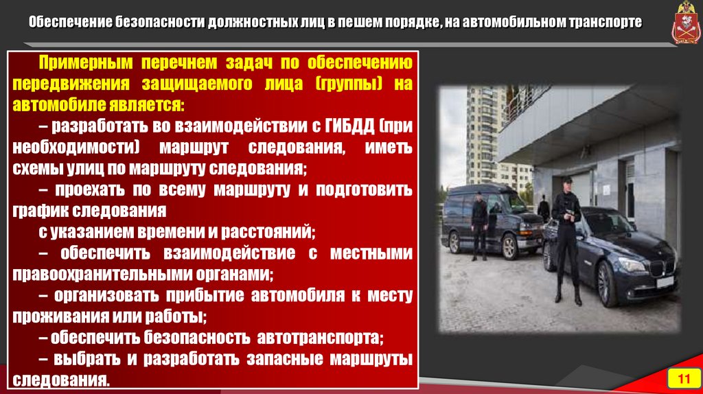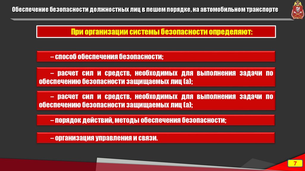 Обеспечение безопасности должностных лиц в пешем порядке, на автомобильном транспортеПри организации системы безопасности определяют: