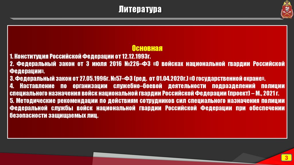 3. Федеральный закон от 27.05.1996г. №57–ФЗ (ред. от 01.04.2020г.) «О государственной охране».
