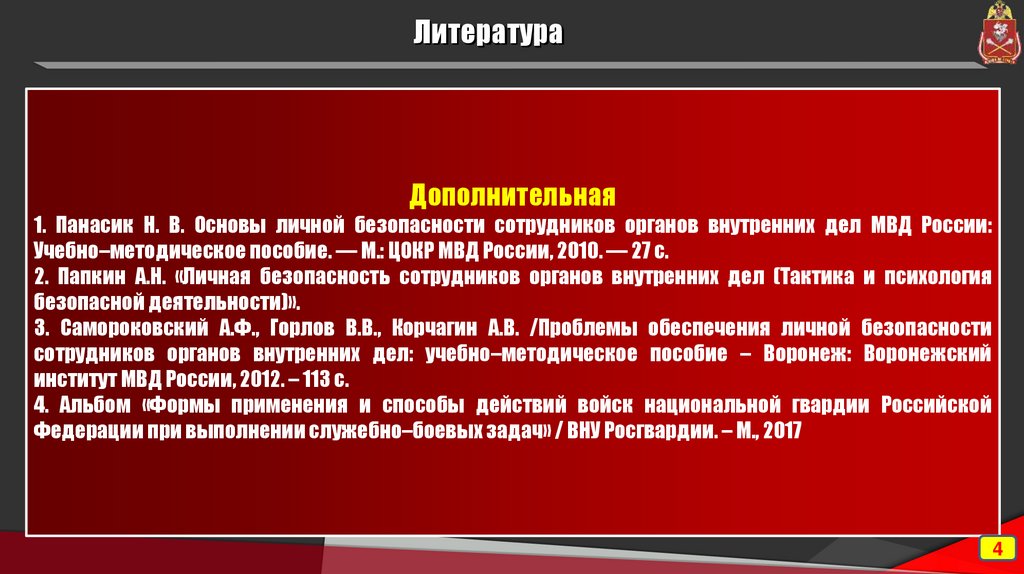 1. Панасик Н. В. Основы личной безопасности сотрудников органов внутренних дел МВД России: