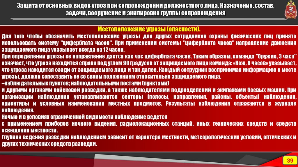 означает, что угроза находится справа под углом 90 градусов от защищаемого лица команда: «Нож, 6 часов» указывает,